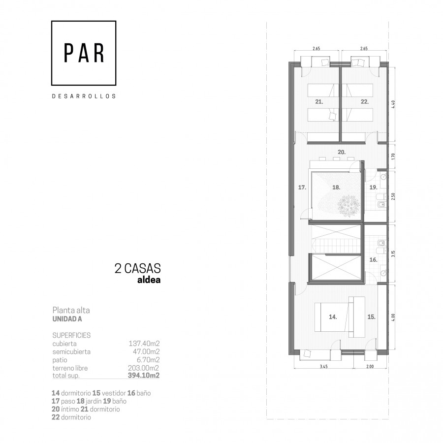 En PA se desarrollan los 3 dormitorios. La suite con vestidor; un baño completo con bañera; un escritorio con ventilación y vista a un patio interno.