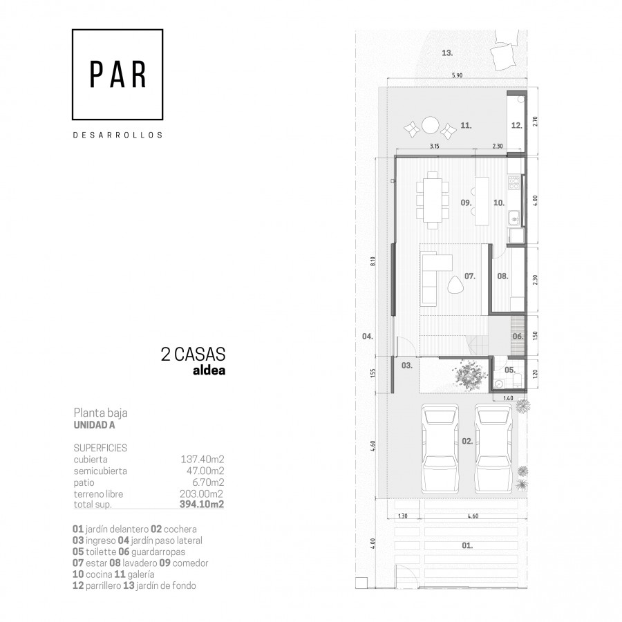 Cuenta con 137,4 m2 cubiertos y 47 semicubiertos desarrollándose en dos plantas.