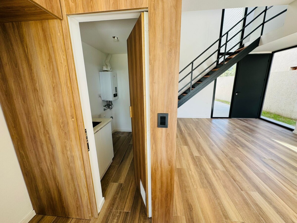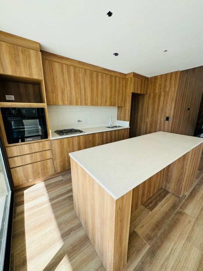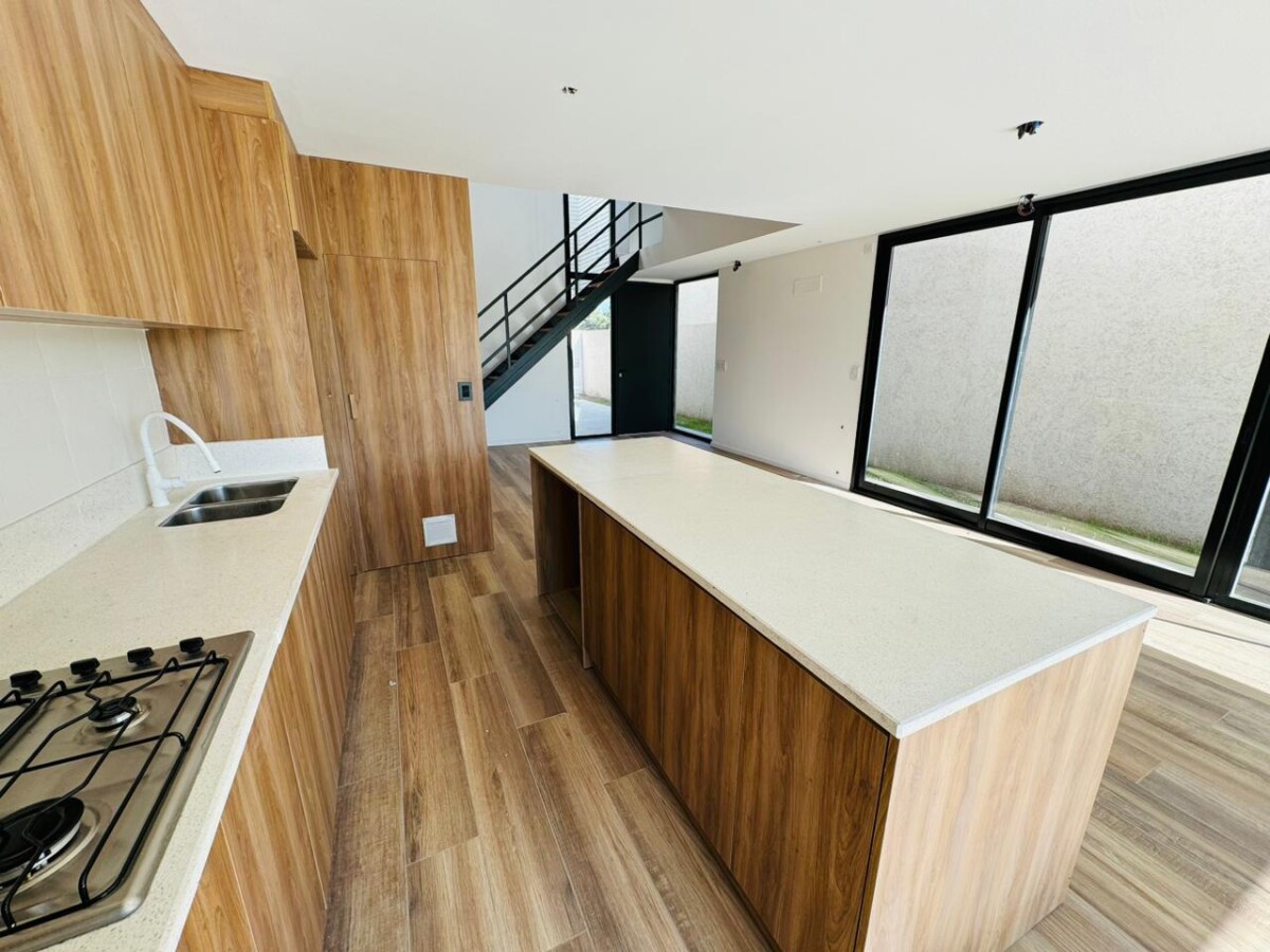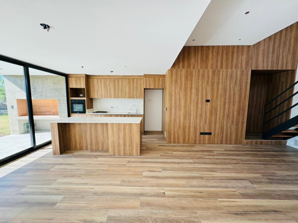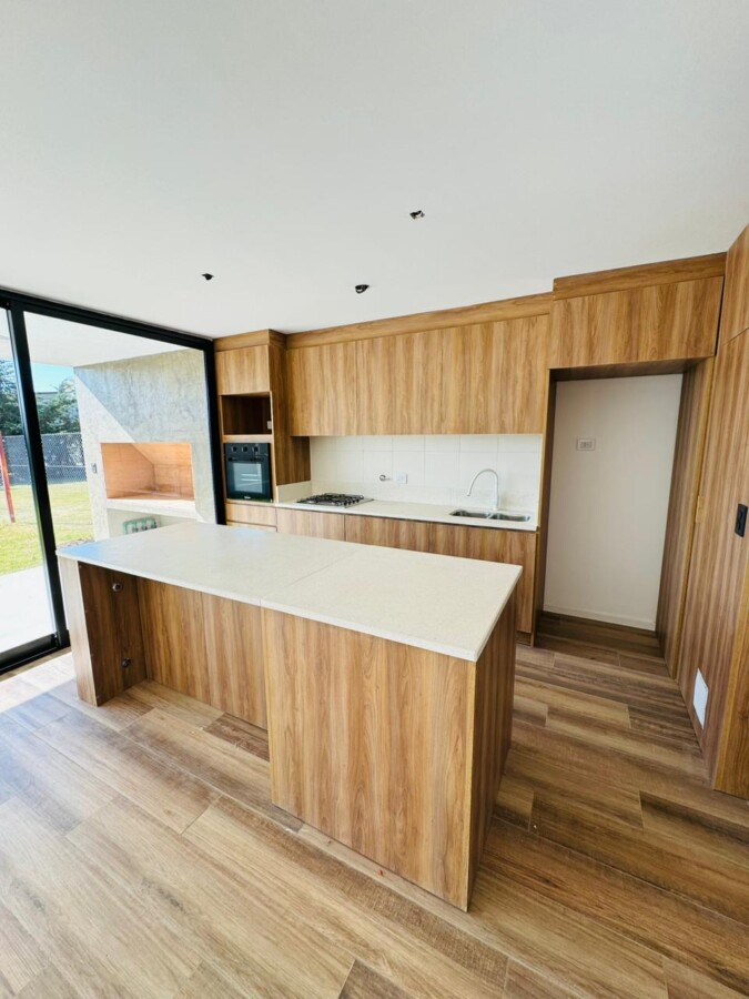 En PB, ingreso a amplio estar comedor con pisos vinílicos símil madera y salida a galería semicubierta con parrillero. Cocina separada por isla con espacio de guardado; lavadero independiente y toilette de recepción.