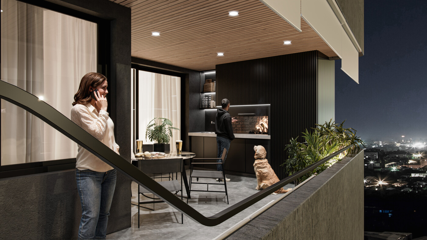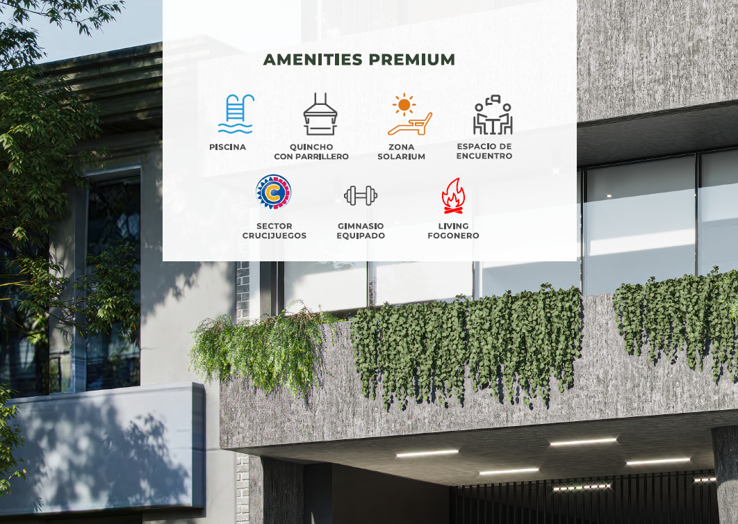Se trata de dos torres de 9 pisos, con departamentos de 1, 2, y 3 dormitorios.  Variedad de servicios exclusivos como gimnasio, amenities premium, sector Crucijuegos, bicileteros, cocheras, bauleras, entre otros.