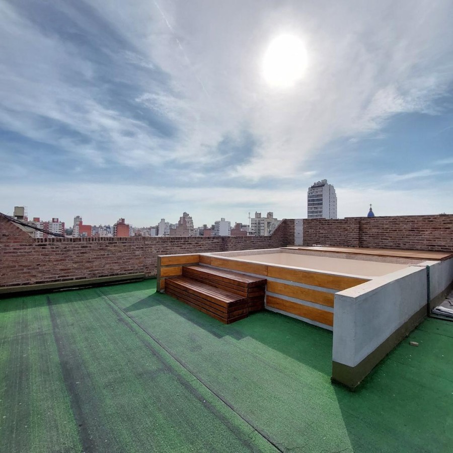 Solarium, pileta y parrillero en terraza.
